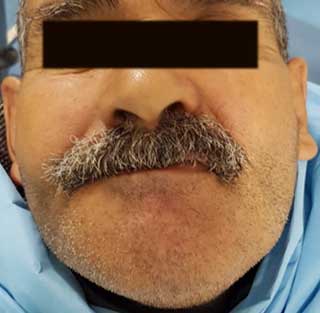 On retrouvait néanmoins une perlèche de la commissure labiale droite par chute de la dimension verticale (Fig 1).L’examen des aires ganglionnaires était négatif. L’examen endobuccal rapportait la persistante des incisives mandibulaires (31 et 32) et la canine mandibulaire (33) gauches. ainsi qu’une tuméfaction de la crête mandibulaire droite s’étendant du site de la canine mandibulaire droite (43) au site de la deuxième molaire mandibulaire droite (47) (Fig 2).