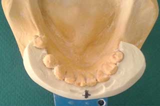 Ensuite nous avons procédé à la rectification du modèle maxillaire en se servant des radiographies et des éléments d’examen clinique, une finition s’impose pour donner un profil arrondi et lisse des crêtes résiduelles (8,9,10) (Fig.8).