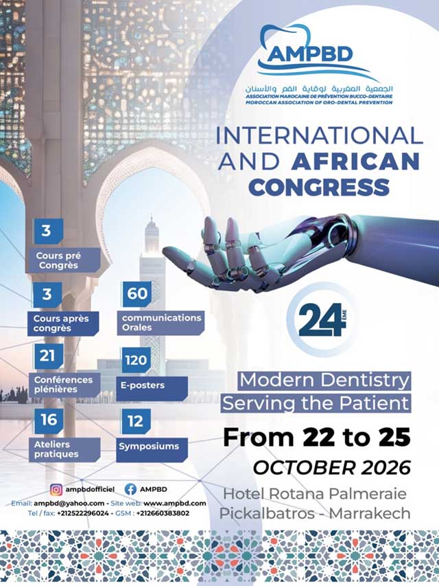 L’Association Marocaine de Prévention Bucco-Dentaire (AMPBD ) a l’honneur d’organiser son 24ᵉ Congrès International et Africain, un rendez-vous scientifique majeur qui réunira des experts, chercheurs, universitaires et praticiens de divers pays autour du thème : “Modern Dentistry Serving the Patient”