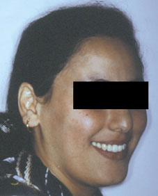 Le traitement orthodontique par multibagues nous a permis grâce à l'utilisation de forces légères de corriger les migrations dentaires, de fermer les espaces et d'ingresser le groupe incisif permettant l'amélioration des récessions gingivales et le rétablissement d'une bonne architecture dento-temporale (Fig5).